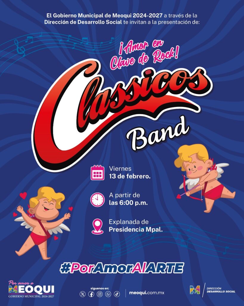 Con canciones como “Fue en un café”, “El último beso”, “Te juro que te amo” y grandes éxitos en inglés, este viernes 13 de febrero se llenará de música la explanada principal durante el festival “Amor en Clave de Rock”, como parte del programa “Por Amor al Arte”, a partir de las 6:00 de la tarde en el marco del Día del Amor y la Amistad, con la presentación de la agrupación Clásicos Band de Meoqui, que se caracteriza por interpretar clásicos del rock en español e inglés de bandas como Los Apson, Terrícolas, Ángeles Negros, The Beatles, Bee Gees, Creedence, entre otros.
