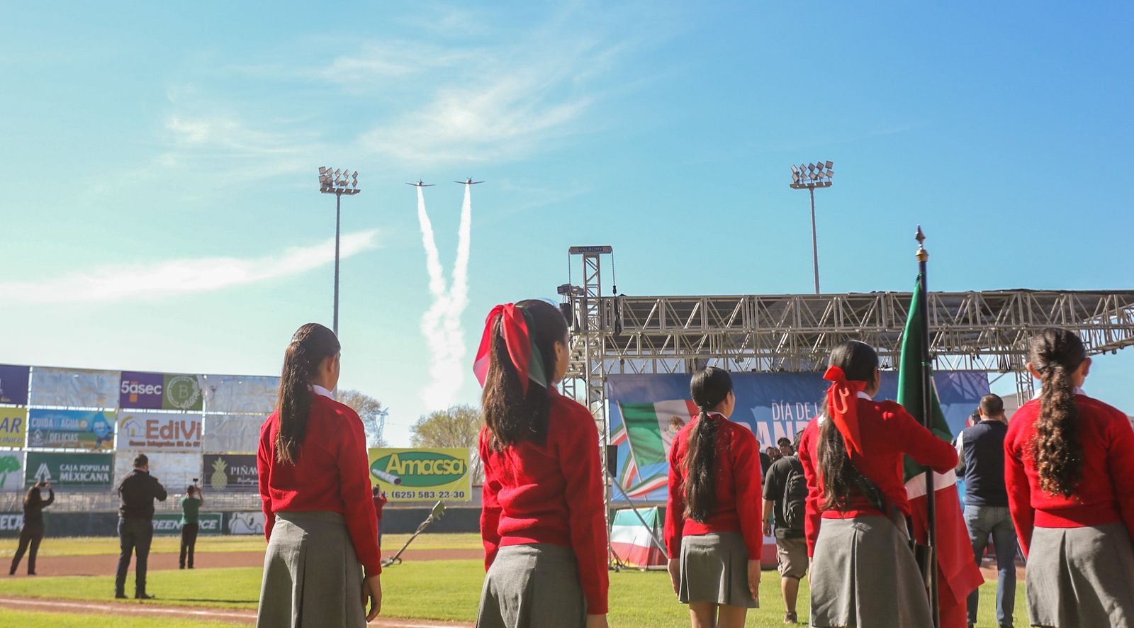 Uno de los momentos más emotivos del acto cívico se vivió cuando dos aviones de la Fuerza Aérea Mexicana sobrevolaron el Gran Estadio de Delicias, generando sorpresa, emoción y aplausos entre las y los estudiantes. El sobrevuelo despertó un ambiente de orgullo y entusiasmo entre los niños, quienes observaron con asombro esta muestra del compromiso de las fuerzas armadas con México.
