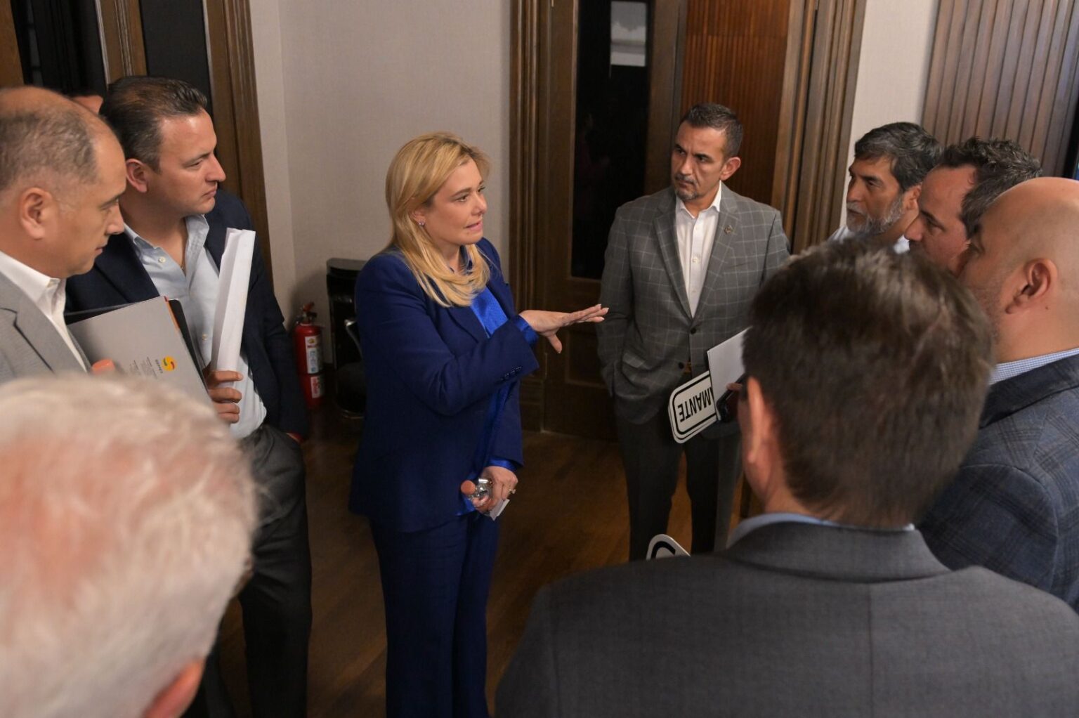 La gobernadora Maru Campos se reunió este lunes en Palacio de Gobierno con empresarios y funcionarios estatales y municipales, para analizar la situación de la ciudad de Chihuahua en el rubro de tránsito y semaforización.